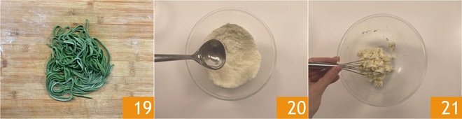 Formad un nido con los espaguetis a la guitarra enharinándolos ligeramente, luego reservadlos a temperatura ambiente 19. Mientras tanto, llevad a ebullición el agua para la cocción de los espaguetis. Ahora ocupáos del condimento de queso y pimienta: en un bol poned el Pecorino romano rallado muy fino, añadid un cucharón de agua de cocción de la pasta 20 y mezclad enérgicamente con un batidor 21 o con una espátula. Debéis obtener una consistencia pastosa y seca, pero lisa y sin grumos. Coced ahora los espaguetis en agua hirviendo durante 2-3 minutos.