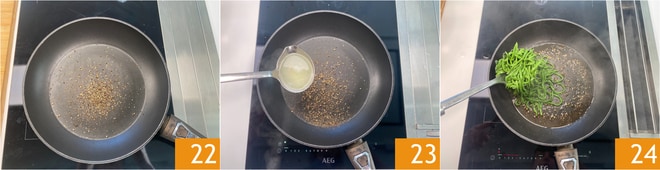 Ahora moléd la pimienta negra en una sartén y tostádla durante unos instantes para intensificar sus aromas y perfumes 22. Añadid un cucharón de agua de cocción de la pasta 23 y escurrid aquí los espaguetis 24.