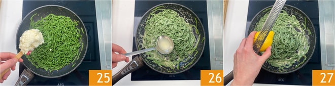 Dejad que la pasta se cocine como un risotto durante 1 minuto más, luego apagad el fuego y añadid la pasta de Pecorino 25. Ajustad la consistencia con un cucharón de agua de cocción y mezclad 26. Completad con la ralladura de limón 27.