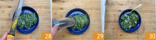Servid los espaguetis a la guitarra verdes con queso y pimienta adornando los platos al gusto con más ralladura de limón 28 y pimienta negra molida 29. ¡Disfrutadlos bien calientes y cremosos 30!