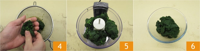 Escurridlas bien presionándolas en un colador 4, luego pasadlas por la batidora 5 para triturarlas 6. Reservad, necesitaréis 200 g de espinacas trituradas.