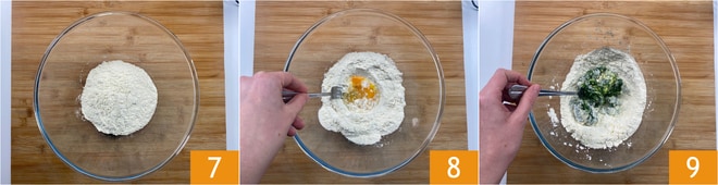 En un bol poned la harina 7 y los huevos 8, luego mezclad con un tenedor para reunir los ingredientes 9.