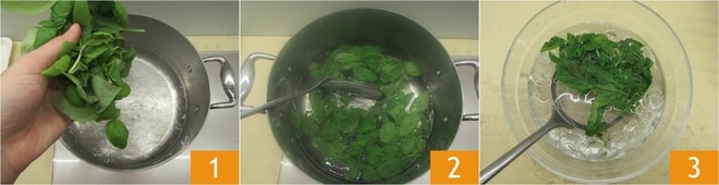 Para preparar los espaguetis a la parmesana con coulis de tomatitos, lo primero que debes hacer es la mantequilla de albahaca que servirá para la mantecación. Pon a hervir una olla llena de agua, sálala al 10% y llévala a ebullición. Sumerge las hojas de albahaca 1, escáldalas durante 30 segundos 2 y luego, usando una espumadera, escúrrelas y transfiérelas a un recipiente con agua y hielo 3. Este paso sirve para detener la cocción y mantener el color vivo de las hojas.