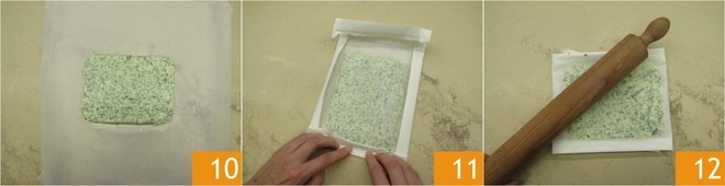 Intenta obtener una forma regular 10. Coloca otra hoja de papel de horno encima y cierra bien los bordes alrededor de la mantequilla 11. Aplana aún más con un rodillo 12 y transfiéralo al frigorífico. La mantequilla de albahaca se solidificará durante el tiempo que tardes en realizar las otras preparaciones.