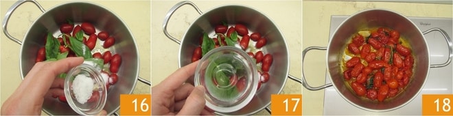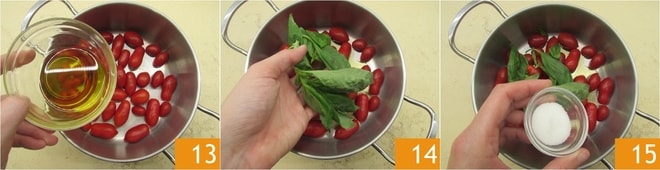 Pasa ahora a preparar el coulis de tomatitos. Vierte los datterini en una cacerola, añade el aceite 13, las hojas de albahaca 14 y el azúcar 15.