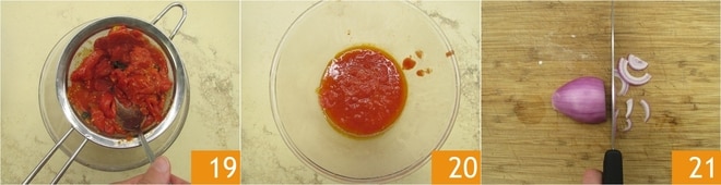 Pasa todo por el colador 19, para recoger el jugo en un bol 20. El coulis está listo: reserva y prepara las berenjenas. Pela la cebolla y córtala en rodajas 21, servirá para la cocción.