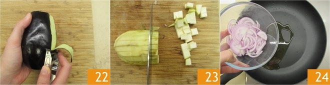 Corta los extremos de las berenjenas y pélalas 22. Córtalas ahora en cubos regulares de unos 1 cm 23. En una sartén vierte 100 g de aceite, la cebolla 24 y el ajo cortado en rodajas, sin el germen. Añade una pizca de sal y deja que se ablanden.