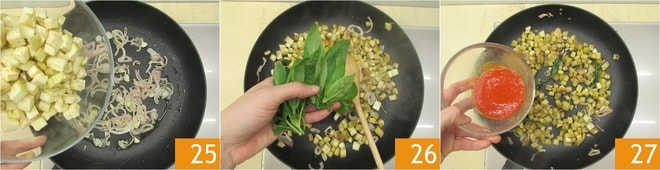 Añade las berenjenas 25, mezcla bien y vuelve a salar; de esta forma las berenjenas soltarán el agua y se cocinarán más fácilmente. Deja que se guisen durante 10 minutos a fuego medio. Cuando las berenjenas empiecen a caramelizarse, añade la albahaca 26. Cocina durante otros 5 minutos, añade unos 50 g de coulis 27, mezcla y cocina durante 2-3 minutos más.