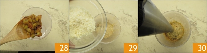 Transfiere las berenjenas al vaso de una batidora de inmersión 28. Añade el pan rallado, el Parmigiano 29, sal y pimienta. Tritura todo hasta obtener una crema gruesa, rústica 30.