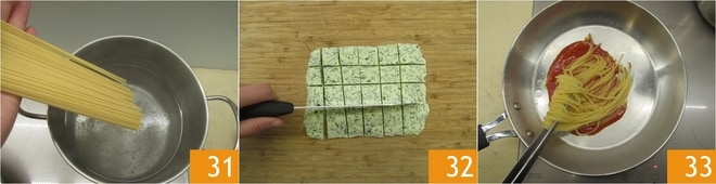 Cocina los espaguetis en abundante agua hirviendo, salada al gusto, durante la mitad del tiempo indicado en el paquete 32. Mientras la pasta se cocina, saca la mantequilla del frigorífico y córtala en cubos 34. Vierte el coulis restante en una sartén grande y transfiere dentro los espaguetis sacándolos con unas pinzas 33.