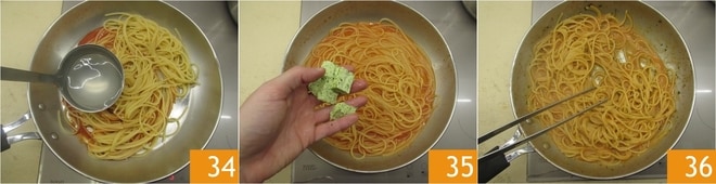 Añade un poco de agua de cocción 34. Saltea los espaguetis y cuando estén bien mezclados, añade unos 80 g de mantequilla de albahaca 35. Mezcla bien para mantecar 36.