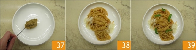 Ahora emplata. Coloca la crema de berenjenas en la base del plato 37 y pon encima los espaguetis. En un lado coloca el Parmigiano rallado, en el otro el pecorino rallado 38 y termina con unas hojas de albahaca 39. ¡Tus espaguetis a la parmesana con coulis de tomate están listos para servir!