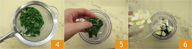 Espera unos segundos, luego coloca las hojas de albahaca en un colador para eliminar el exceso de agua 4. Apriétalas ligeramente y sécalas con papel absorbente, luego transfiérelas a una batidora 5. Agrega también la mantequilla a temperatura ambiente 6.
