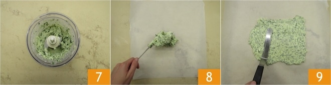 Tritura todo hasta obtener una crema homogénea 7. Ahora transfiere la mezcla sobre una hoja de papel de horno 8 y extiéndela con una espátula hasta formar una capa fina 9.