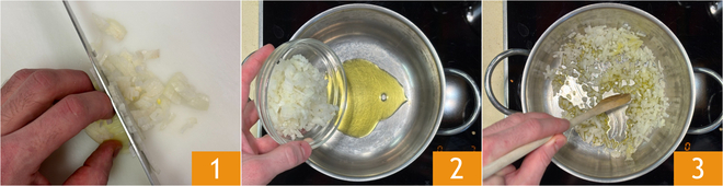 Para preparar los espaguetis con albóndigas de salchicha y salsa de tomates amarillos, empieza por la salsa: pica finamente la cebolla 1 y colócala en una cacerola con un chorrito de aceite 2, luego déjala sofreír suavemente durante unos diez minutos 3.