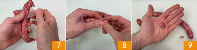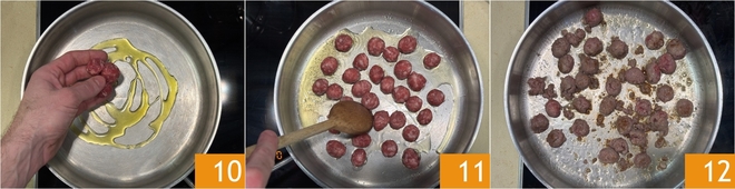 Mientras tanto, dedícate a las albóndigas: elimina el pellejo de la salchicha 7, luego separa trocitos de carne con las manos 8 y forma pequeñas albóndigas 9.