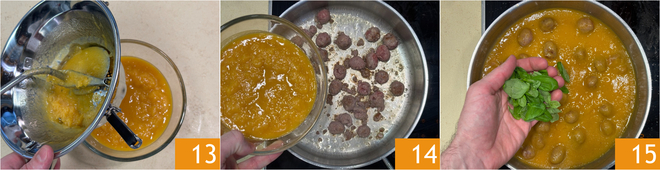 Pasado el tiempo de cocción de la salsa, pásala por un pasapurés para obtener una salsa suave y aterciopelada 13. Une la salsa a las albóndigas 14 y perfuma con algunas hojas de albahaca 15, luego mezcla suavemente para amalgamar.