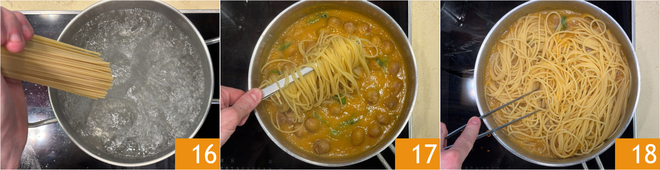 Mientras tanto, cuece los espaguetis en agua hirviendo con sal 16. Escurre la pasta muy al dente y transfiérela a la sartén con el condimento 17, enciende el fuego y saltea todo durante 2-3 minutos añadiendo agua de cocción si es necesario 18.
