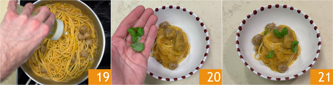 A fuego apagado, manteca con un chorrito de aceite 19. Emplata y adorna con hojas frescas de albahaca 20. ¡Tus espaguetis con albóndigas de salchicha y salsa de tomates amarillos están listos para servirse 21!