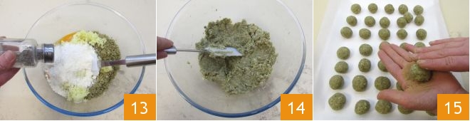 Ajusta entonces de sal y pimienta 13 y mezcla con cuidado: debes obtener una consistencia pastosa y bastante firme 14, fácil de trabajar. Es el momento de formar las albóndigas: humedécete las manos y forma bolitas con unos 15 g de masa cada una. A medida que estén listas, coloca las albóndigas en una bandeja forrada con papel de horno 15.