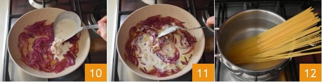 Cuando la salsa esté lista, vertedla sobre las cebollas 10 y mezclad para amalgamar 11. Coced los espaguetis al dente, ajustándoos al tiempo indicado en el paquete 12.