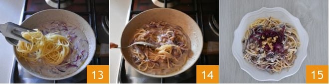 Escurrid la pasta directamente en la sartén con la salsa, con el fuego apagado 13, mezclad para sazonar 14 y servid los espaguetis con cebollas rojas, nueces y gorgonzola bien calientes 15.