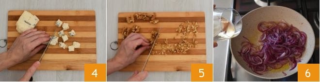 Mientras tanto, cortad el gorgonzola en cubos 4 y picad las nueces 5. Cuando las cebollas estén más blandas, rociad con el vino blanco 6, dejad evaporar el alcohol y luego apagad el fuego.