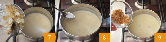 En un cazo verted la leche y calentadla, añadid el gorgonzola en cubos 7 y dejad que se derrita completamente. En este punto, salpimentad 8 y agregad las nueces picadas 9. Mezclad y coced durante otros 10 minutos. Mientras tanto, poned en el fuego una olla llena de agua con sal y llevad a ebullición, servirá para la cocción de la pasta.