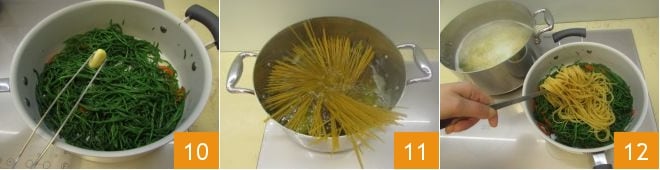 Finalmente, retira el ajo 10. Lleva nuevamente a ebullición el agua en la que has escaldado los espárragos de mar para cocer los espaguetis 11. Cuando falten 3-4 minutos para el final de la cocción, escúrrelos (reservando el agua de cocción) para saltearlos en la sartén con el condimento 12.