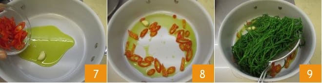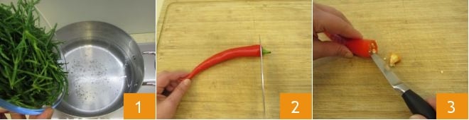 Para preparar los espaguetis con espárragos de mar, comienza poniendo al fuego una olla con agua, donde cocerás tanto los espárragos de mar como la pasta. Sin embargo, ten cuidado de no añadir sal, ya que este tipo de planta es muy salada. Tan pronto como el agua esté hirviendo, escalda los espárragos de mar durante 2-3 minutos (si los has comprado envasados, no será necesario enjuagarlos. En cualquier caso, sigue las instrucciones del envase) 1. Mientras tanto, puedes dedicarte al condimento. Elimina el pedúnculo del chile 2 y, con una navaja, entra suavemente en el interior para retirar las hebras 3.