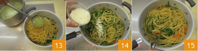 y continúa la cocción agregando agua según sea necesario 13. Una vez listos, apaga el fuego y añade el Parmesano rallado 14, mezclando bien todo 15.