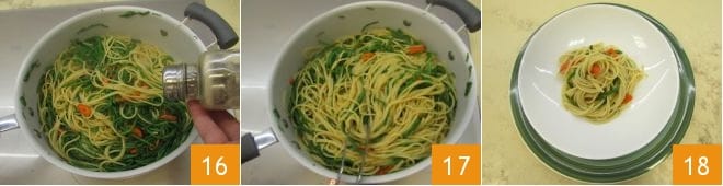 Luego espolvorea con un poco de pimienta negra 16, da una última salteada 17 y tus espaguetis con espárragos de mar están listos para llevar a la mesa 18.