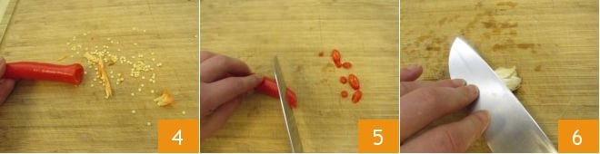 Después, golpea el chile sobre la tabla de cortar para que salgan todas las semillas 4. Corta en rodajas de aproximadamente medio centímetro y reserva 5. Luego, aplasta ligeramente el diente de ajo con un cuchillo 6 para pelarlo más fácilmente.