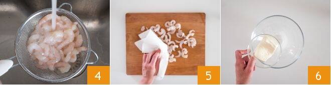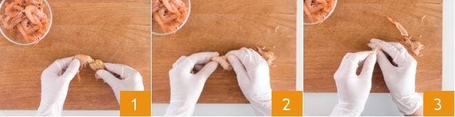 Para preparar los espaguetis con gambas, stracchino y azafrán, primero ocupaos de la limpieza de las gambas. Poneos un par de guantes de látex y, aplicando una ligera presión, eliminad la cabeza 1, la cola y el caparazón 2. Luego, utilizando un palillo, eliminad cuidadosamente el filamento negro 3.