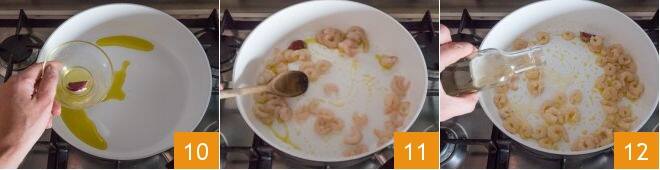 Poned en el fuego una olla llena de agua, llevadla a ebullición y luego salarla para la cocción de la pasta. En una sartén, verted un poco de aceite y el ajo recién aplastado 10; dejadlo dorar y luego añadid las gambas y saltead todo durante medio minuto a fuego vivo 11. Después, verted el vino blanco 12