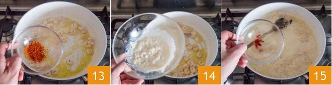 y cuando se haya evaporado completamente, añadid un poco de guindilla en polvo 13, la crema de stracchino 14 y el azafrán 15.
