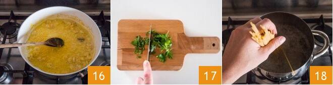 Mezclad bien y coced hasta que el queso se haya derretido 16. Mientras tanto, picad el perejil 17 y coced también la pasta 18.