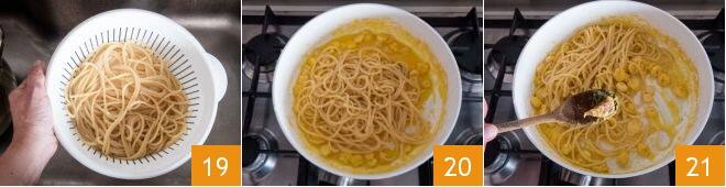 Escurridla al dente 19 y transferidla a la sartén con el condimento 20. Eliminad el diente de ajo 21