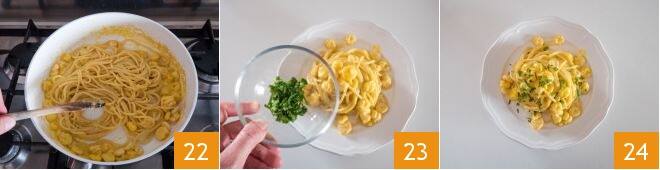 y saltead la pasta junto con el condimento 22. En este punto, emplatad decorando con un poco de perejil 23 y servid vuestros espaguetis con gambas, stracchino y azafrán 24.
