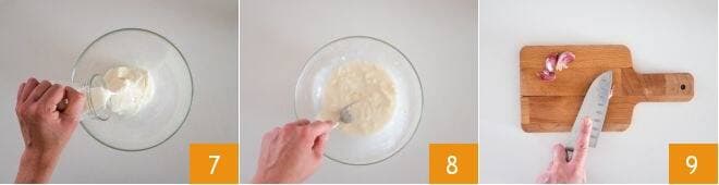 agregad la leche 7 y trabajadlo con un tenedor hasta obtener una mezcla cremosa 8. Aplasta luego un diente de ajo utilizando la hoja de un cuchillo 9.