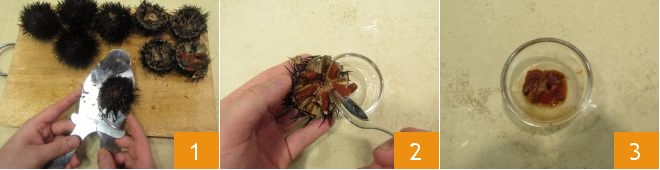 Para preparar los espaguetis con mejillones y erizos de mar, lo primero que hay que hacer es Cómo limpiar los erizos de mar. Comenzad cortando los erizos con la herramienta adecuada 1, enjuagad la parte interesada bajo agua corriente y ayudándoos con una cucharita extraed las huevas (la parte naranja) 2; luego ponedlas a un lado en un bol pequeño 3.