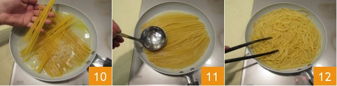 En este punto, tomad los espaguetis 10 y agregadlos a la sartén, cociendo como si fuera un risotto, añadiendo agua hirviendo según sea necesario 11. Antes de agregar otro cucharón de agua, esperad a que el anterior sea absorbido por completo. Coced los espaguetis de este modo, removiendo a menudo para que no se peguen 12.