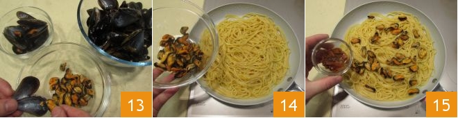 Mientras los espaguetis se cocinan, retirad las cáscaras de los mejillones y reservadlos 13. Tan pronto como los espaguetis estén cocidos, añadid los mejillones 14 y los erizos de mar 15.