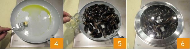 En este punto, en una sartén antiadherente, calentad el aceite y dorad ligeramente el diente de ajo. Tan pronto como esté dorado, retiradlo 4 y agregad los mejillones previamente limpios (para todas las indicaciones sobre cómo limpiar los mejillones Cómo limpiar y abrir los mejillones). Desglasad con el vino blanco 5 y cubrid con una tapa 6.