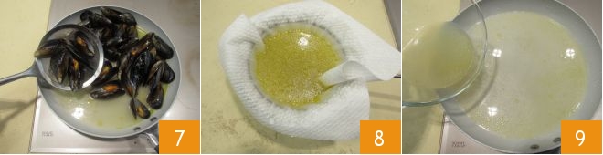Dejad cocer unos minutos hasta que se abran, luego con una espumadera recoged todos los mejillones 7. Proceded filtrando el jugo de los mejillones 8, luego volved a ponerlo en la sartén y llevadlo a ebullición 9.