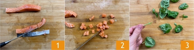Para preparar los espaguetis con salmón y stracciatella al albahaca, comenzad con el salmón. Quitadle la piel 1 y cortadlo en cubitos de 2 cm 2. Ahora tomad las hojas de albahaca y separadlas de los tallos 3. Poned al fuego una olla que servirá para la cocción de la pasta.