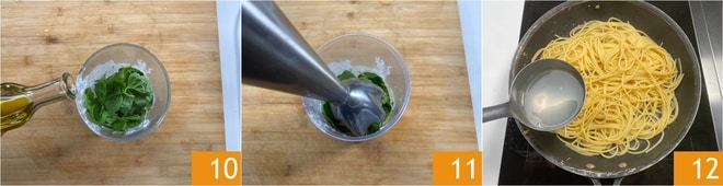 Mientras tanto, en un recipiente de bordes altos verted la stracciatella, la albahaca y una cucharada de aceite 10. Batid todo hasta obtener una crema lisa 11. Pasados los 5 minutos, escurrid la pasta (sin tirar el agua de cocción) y transferidla a la sartén donde habíais cocinado el salmón. Continuad la cocción de la pasta añadiendo 1 cucharón de agua de cocción según sea necesario 12. De esta manera se formará una deliciosa crema.