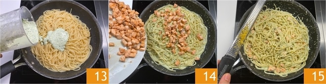 Unid la crema de stracciatella y albahaca 13 y saltead todo. Añadid los cubitos de salmón 14 y la cáscara de limón 15.