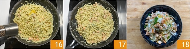 Añadid también un rallado de pimienta negra 16 y saltead bien la pasta 17 antes de servirla 18.