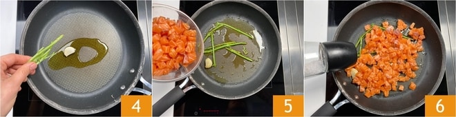 En una sartén amplia calentad un chorrito de aceite junto con un diente de ajo y los tallos de albahaca 4. Dejad que se impregne de sabor y añadid los cubitos de salmón 5. Añadid sal y pimienta 6 y cocinad a fuego alto durante 4 minutos. Mientras tanto, rallad la cáscara del limón y exprimid su jugo.